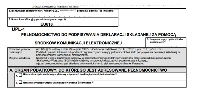 - UPL-1 pełnomocnictwo do podpisywania deklaracji składanych w formie elektronicznej,