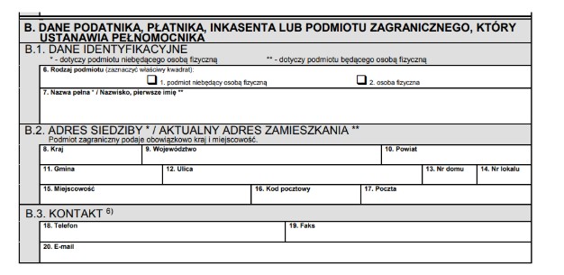 W części B wpisać należy dane Podatnika. Jeśli wypełniasz to, jako osoba fizyczna wpisujesz imię i nazwisko, a w przypadku podmiotów będzie to pełna nazwa.