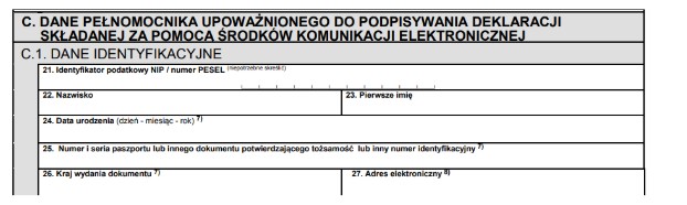 Części C.2 i C.3 nie jest obowiązkowe. Warto jednak podać dane kontaktowe pełnomocnika. Wtedy też w razie nieścisłości w wysłaniu deklaracji, Urząd Skarbowy może kontaktować się z pełnomocnikiem.