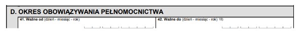 Okres obowiązywania pełnomocnictwa. To w tym miejscu określamy, od kiedy ma obowiązywać pełnomocnictwo i do kiedy. Jeśli nie wypełnienie pola numer 42 będzie równoznaczne z udzieleniem pełnomocnictwa bezterminowo.