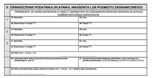 W ostatniej już części E należy wpisać dane osoby, która składa pełnomocnictwo.